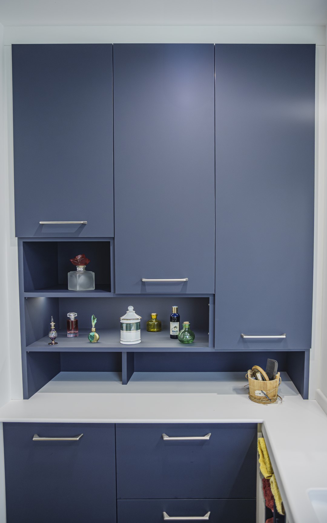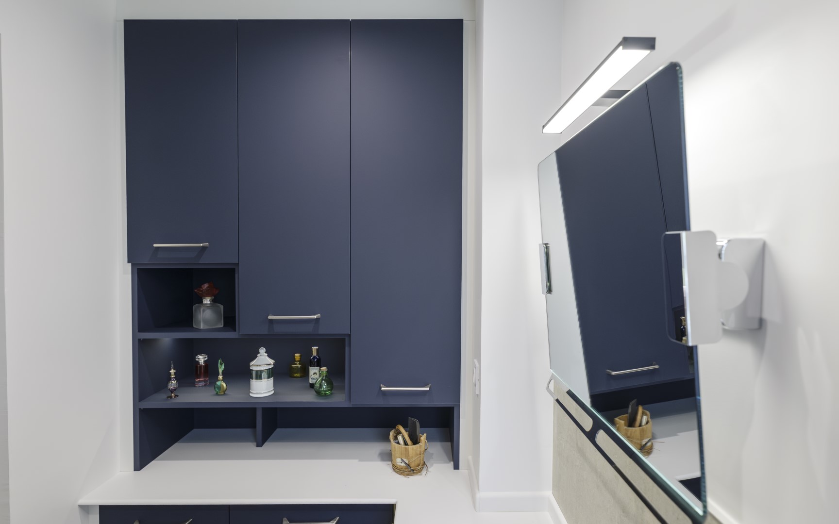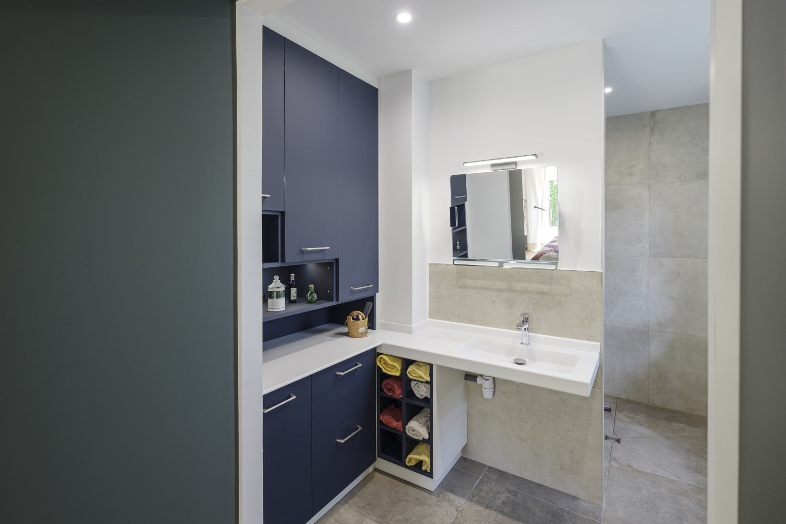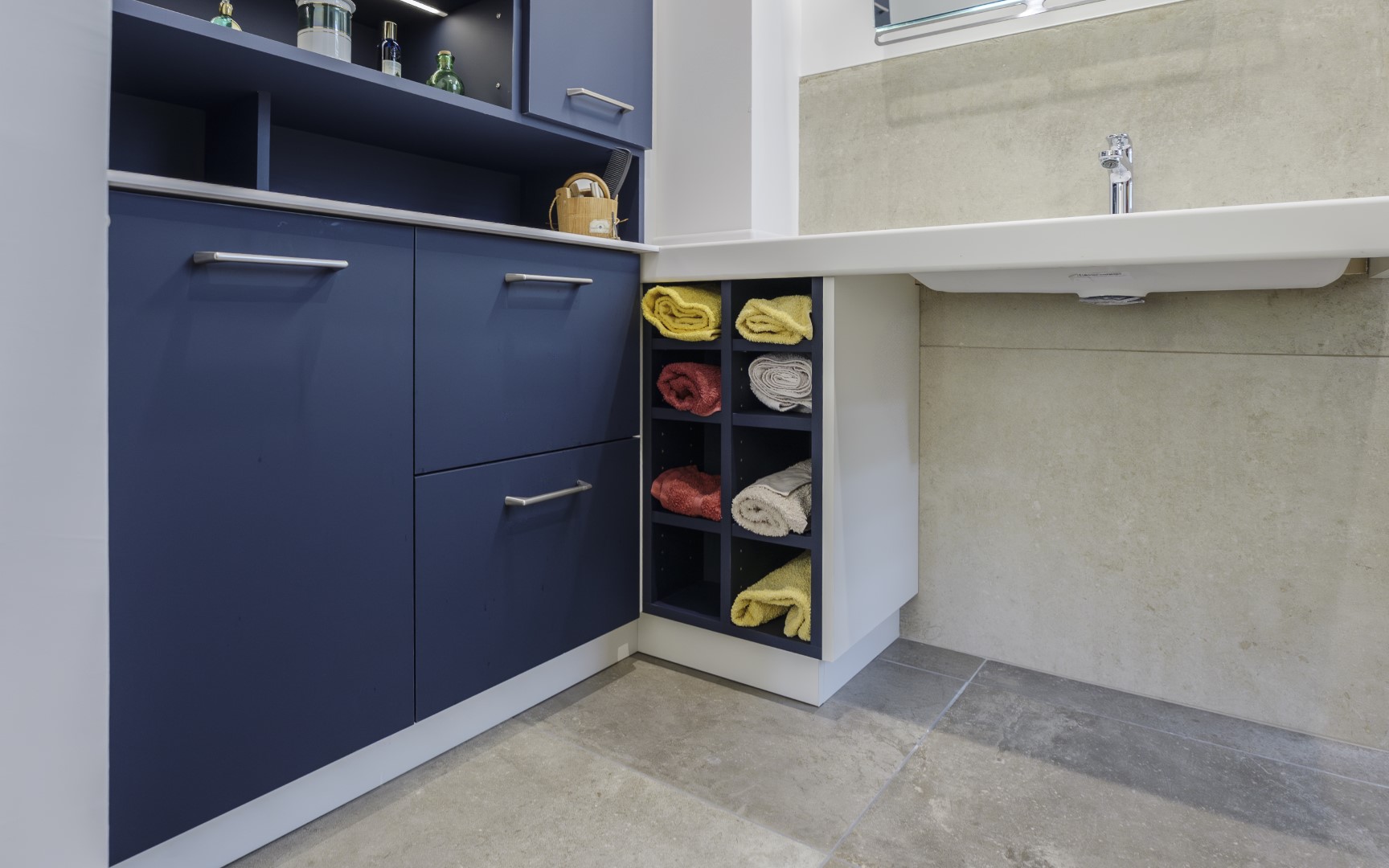 À l’intérieur, un meuble de rangement bleu apporte une touche de modernité et de sophistication. Ce meuble, doté de tiroirs et d’étagères, permet de ranger efficacement tous vos produits de toilette et accessoires.