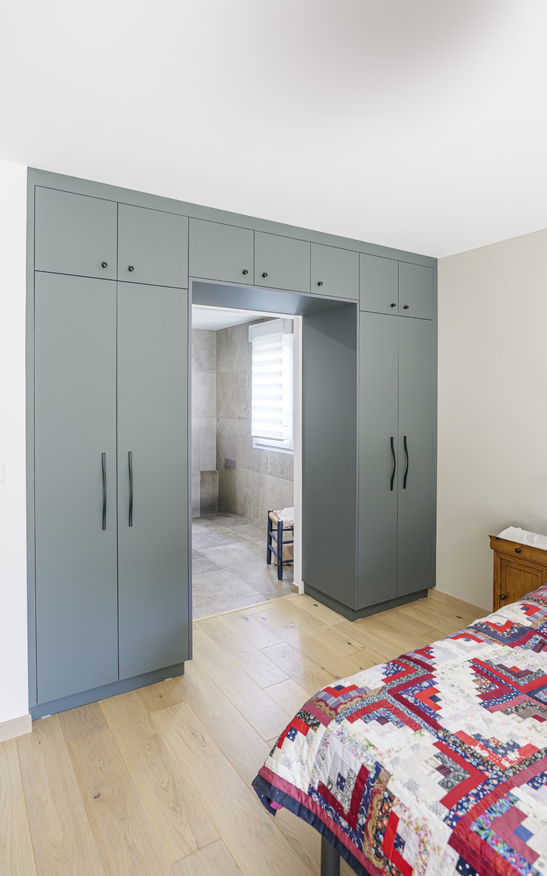 Dès l’entrée, un meuble de rangement vert accueille vos affaires avec style. Ce meuble, aux lignes épurées et poignées discrètes, offre un espace de rangement supplémentaire pour les serviettes, produits de toilette et autres accessoires.