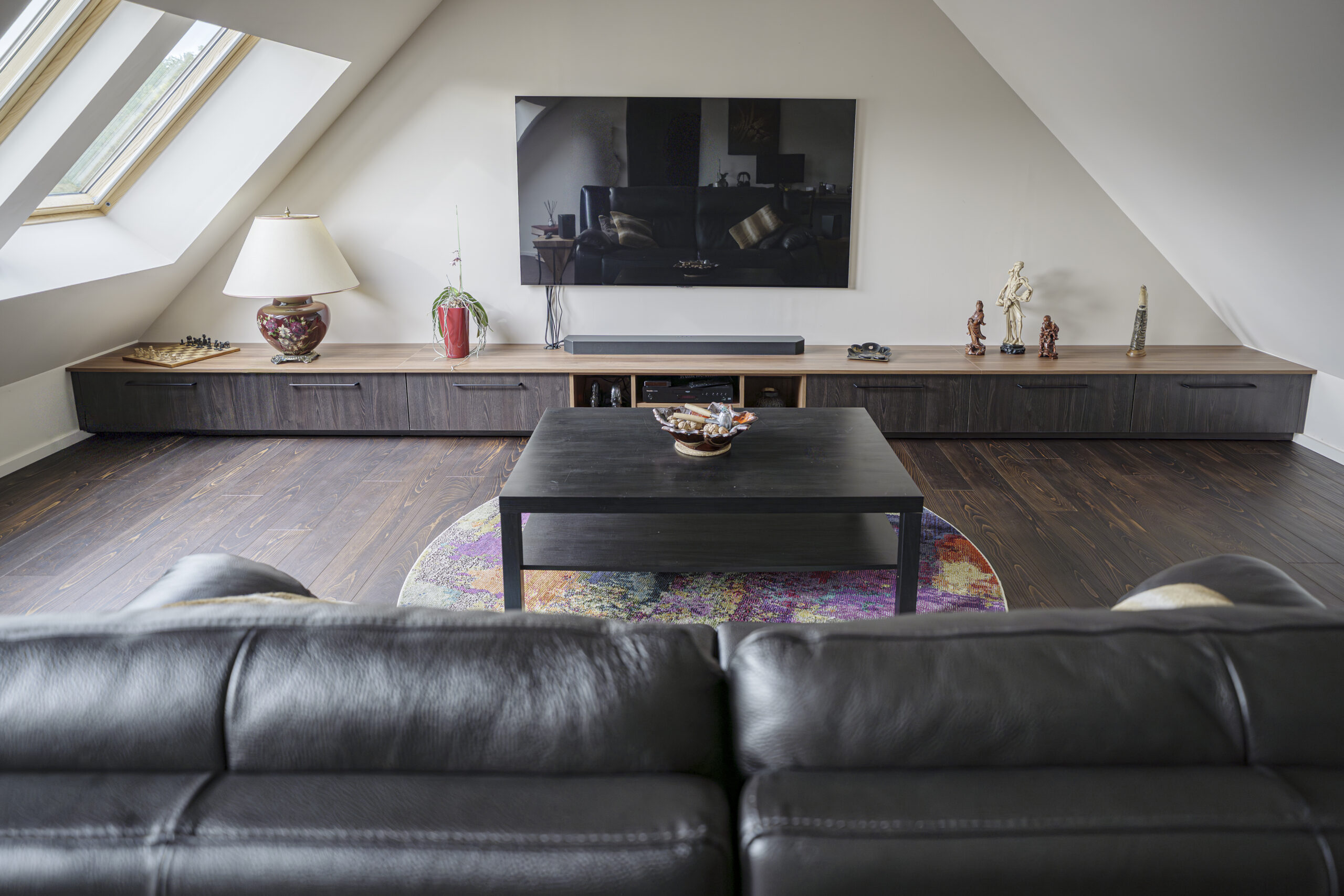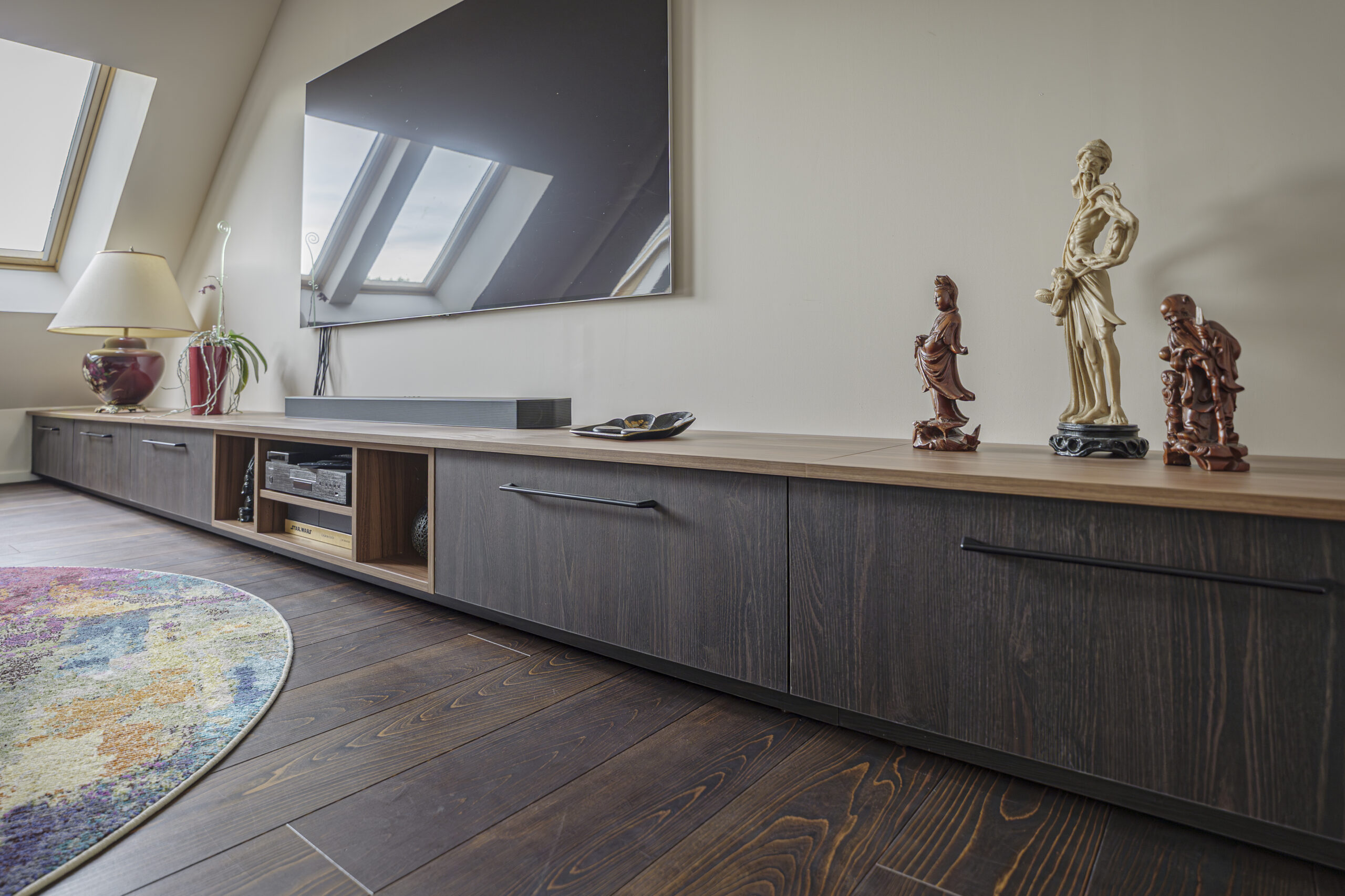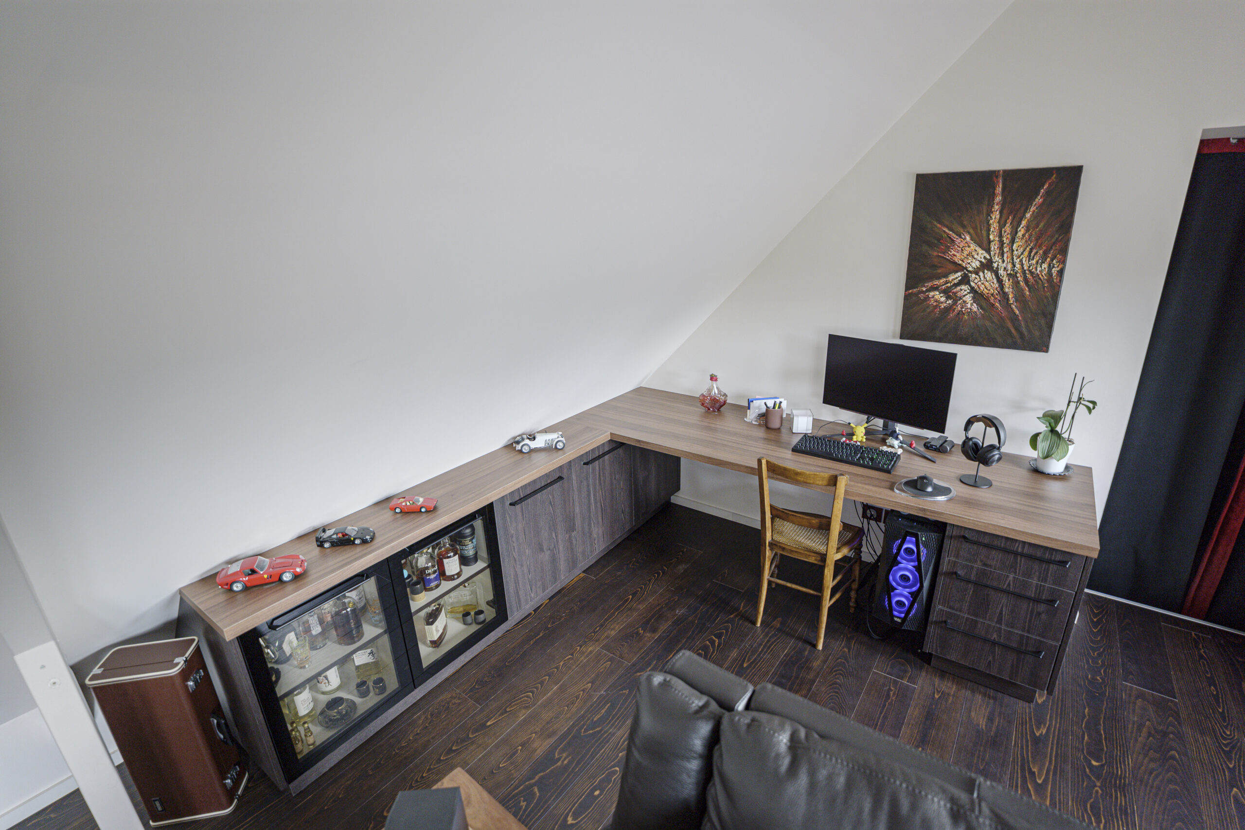 Découvrez comment un aménagement sous comble peut transformer un espace inutilisé en un salon complet sur mesure. Réalisé à Caen par Profil Aménagement, ce projet allie canapé, meuble TV, bureau et bar pour créer un espace convivial, fonctionnel et élégant.