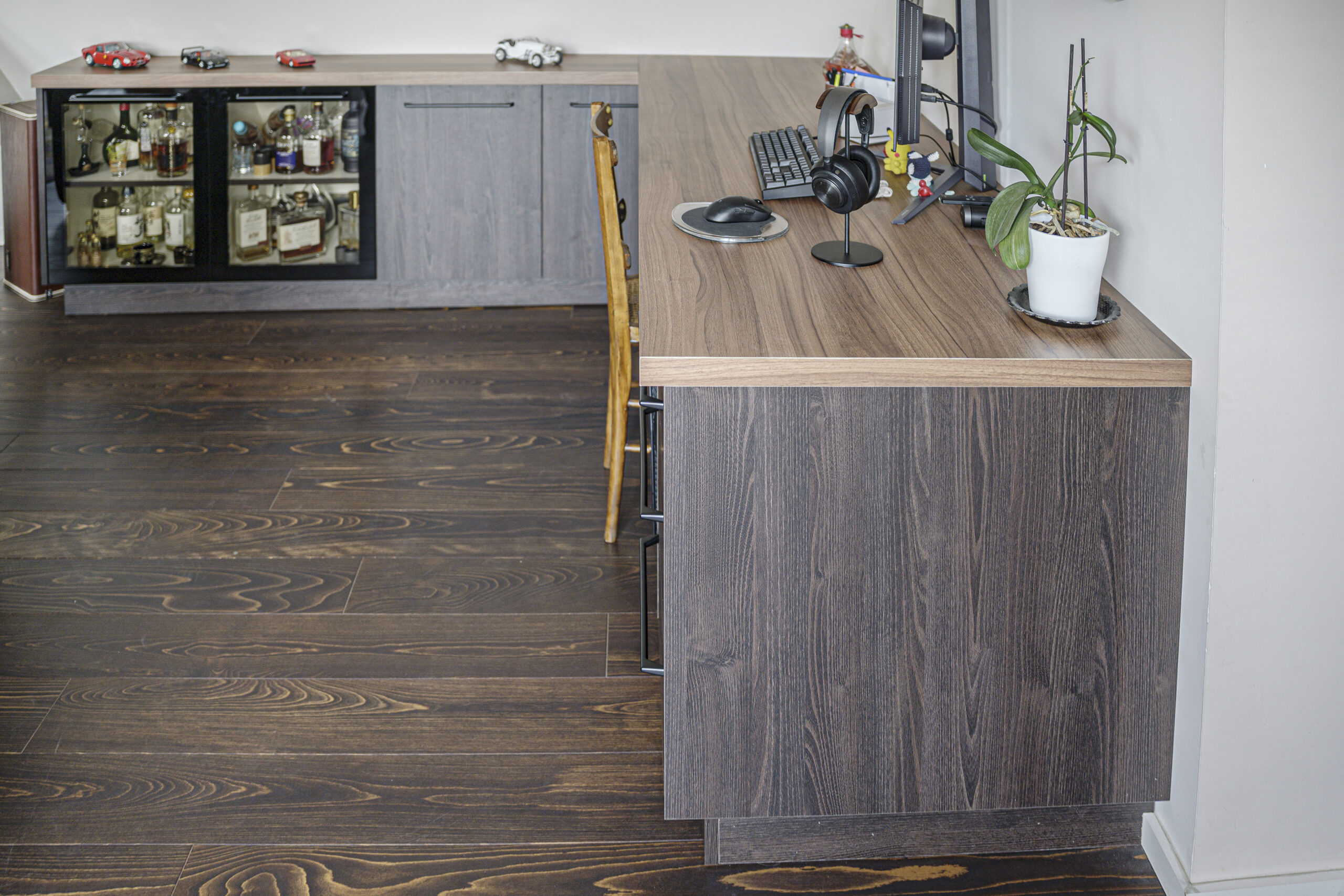 Le canapé offre un espace confortable pour se détendre et recevoir vos invités. En face, le meuble TV sur mesure, avec ses rangements intégrés, permet de cacher les accessoires multimédias tout en mettant en valeur votre écran. À côté, le bureau propose un espace de travail pratique et bien organisé. Enfin, le bar intégré avec ses étagères vitrées ajoute une touche d’élégance et de convivialité.