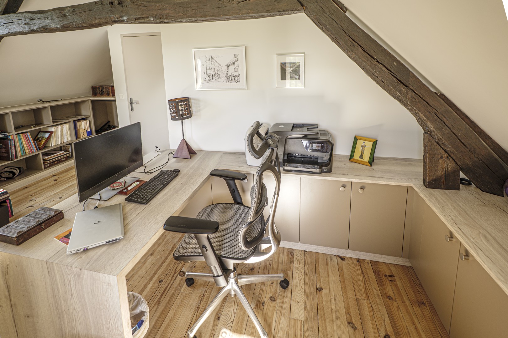 Le défi : intégrer un bureau ergonomique sous une pente de toit marquée, avec poutres apparentes et faible hauteur sous plafond. Le résultat ? Un plan de travail sur mesure en L, adapté à l’architecture de la pièce, permettant un poste informatique confortable, une zone d’impression, et une surface de travail dégagée.