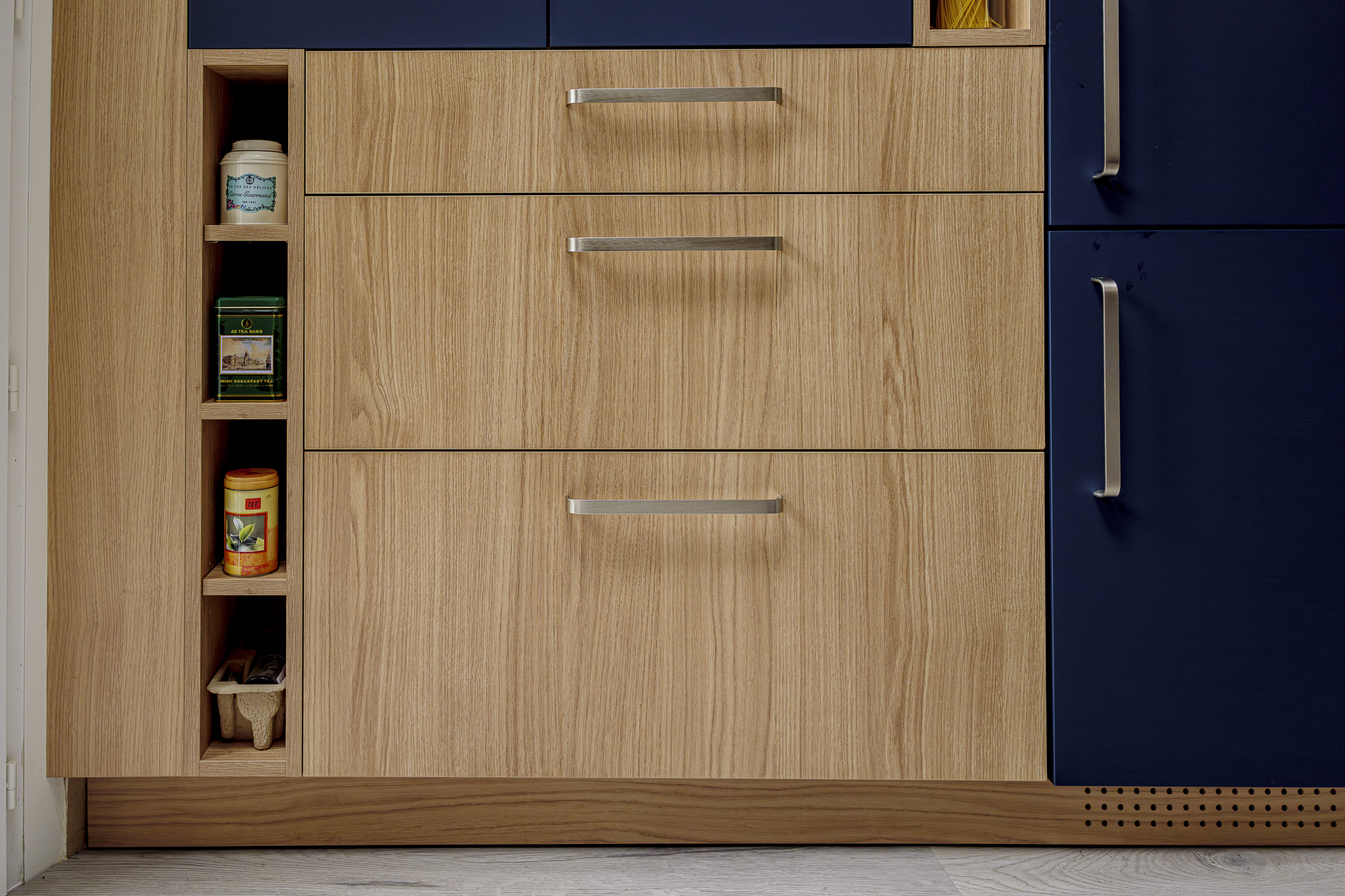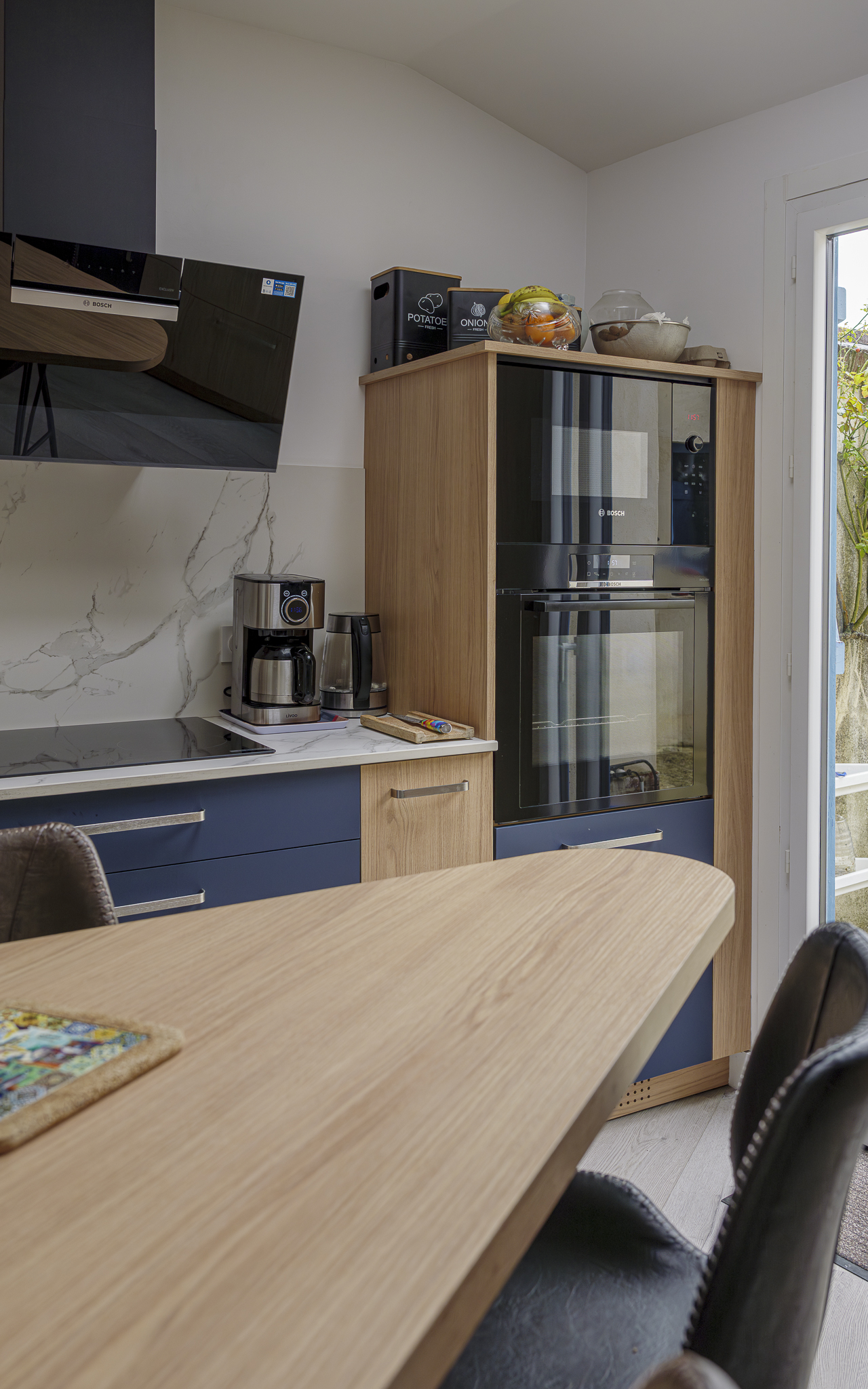 Le choix des façades en bois clair combinées à des éléments bleu mat apporte une véritable identité visuelle à cette cuisine. Ce contraste subtil crée une ambiance chaleureuse tout en conservant une touche contemporaine. Les poignées métalliques renforcent cette esthétique moderne, tandis que les lignes épurées offrent une sensation de légèreté.