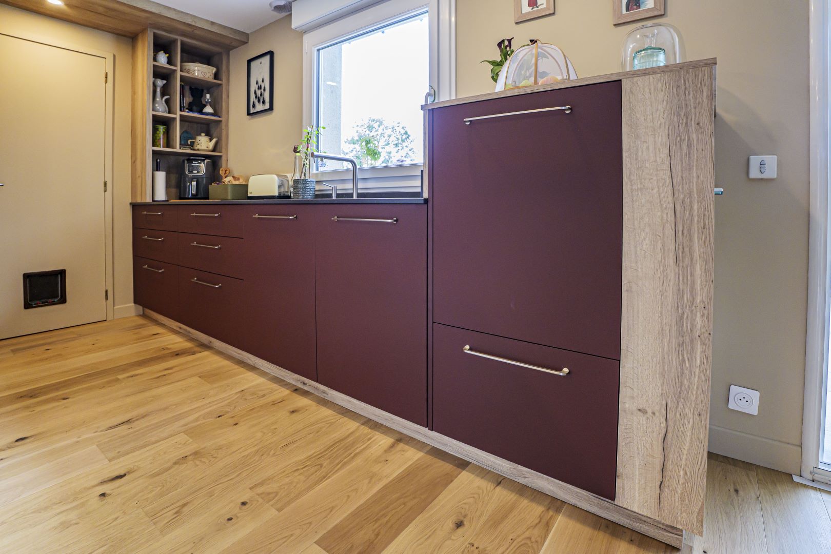 Cette cuisine se distingue par une palette de couleurs terracotta. Elle crée une atmosphère accueillante et chaleureuse. Le contraste entre le terracotta et le bois clair du plan de travail apporte une touche moderne et naturelle. Cette combinaison s’intègre parfaitement dans un intérieur contemporain et ajoute une forte identité à l’espace.