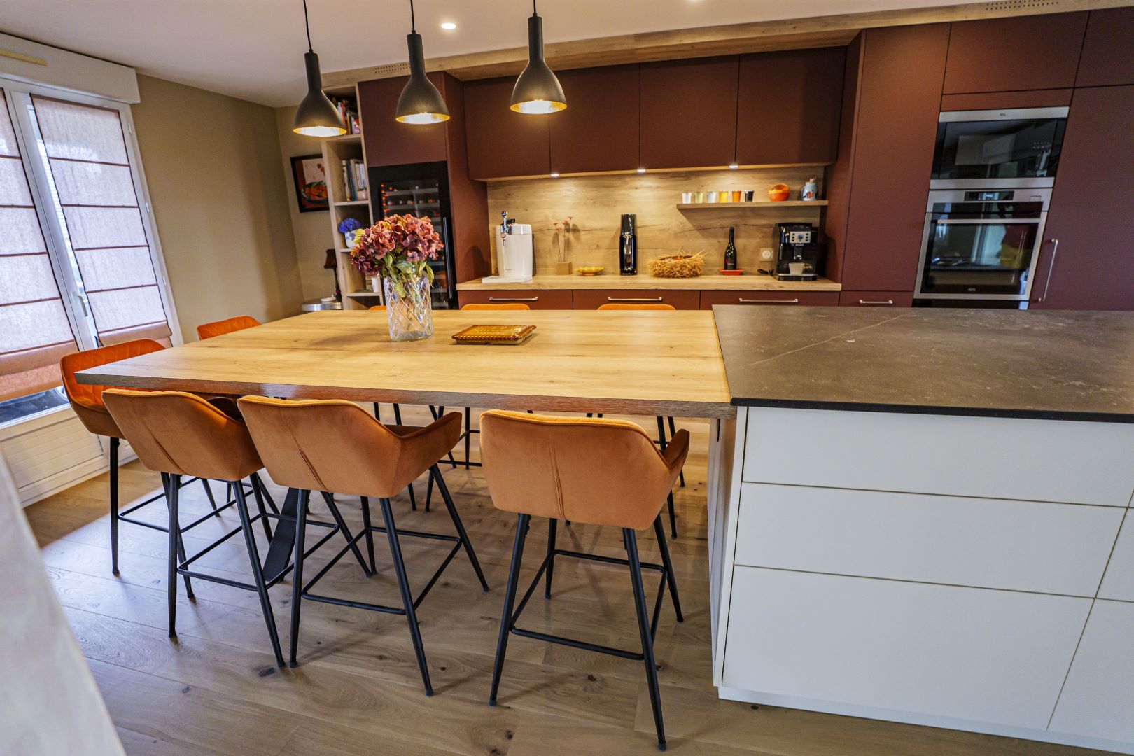Cette cuisine sur mesure, signée Profil Aménagement, combine design et praticité. Avec ses couleurs terracotta, son îlot convivial, ses rangements optimisés et ses équipements intégrés, elle est parfaite pour ceux qui recherchent une cuisine personnalisée et moderne. Contactez-nous pour réaliser votre projet de cuisine sur mesure et profitez d’un espace unique, adapté à vos besoins et à votre style de vie. Pour toute demande de renseignement, n’hésitez pas à visiter notre page contact.