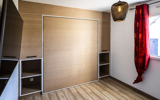 Profil Aménagement a conçu et installé un lit escamotable avec rangements intégrés pour un client à Caen, dans le Calvados. Ce projet sur mesure répond à un besoin d’optimisation de l’espace en combinant praticité et design.