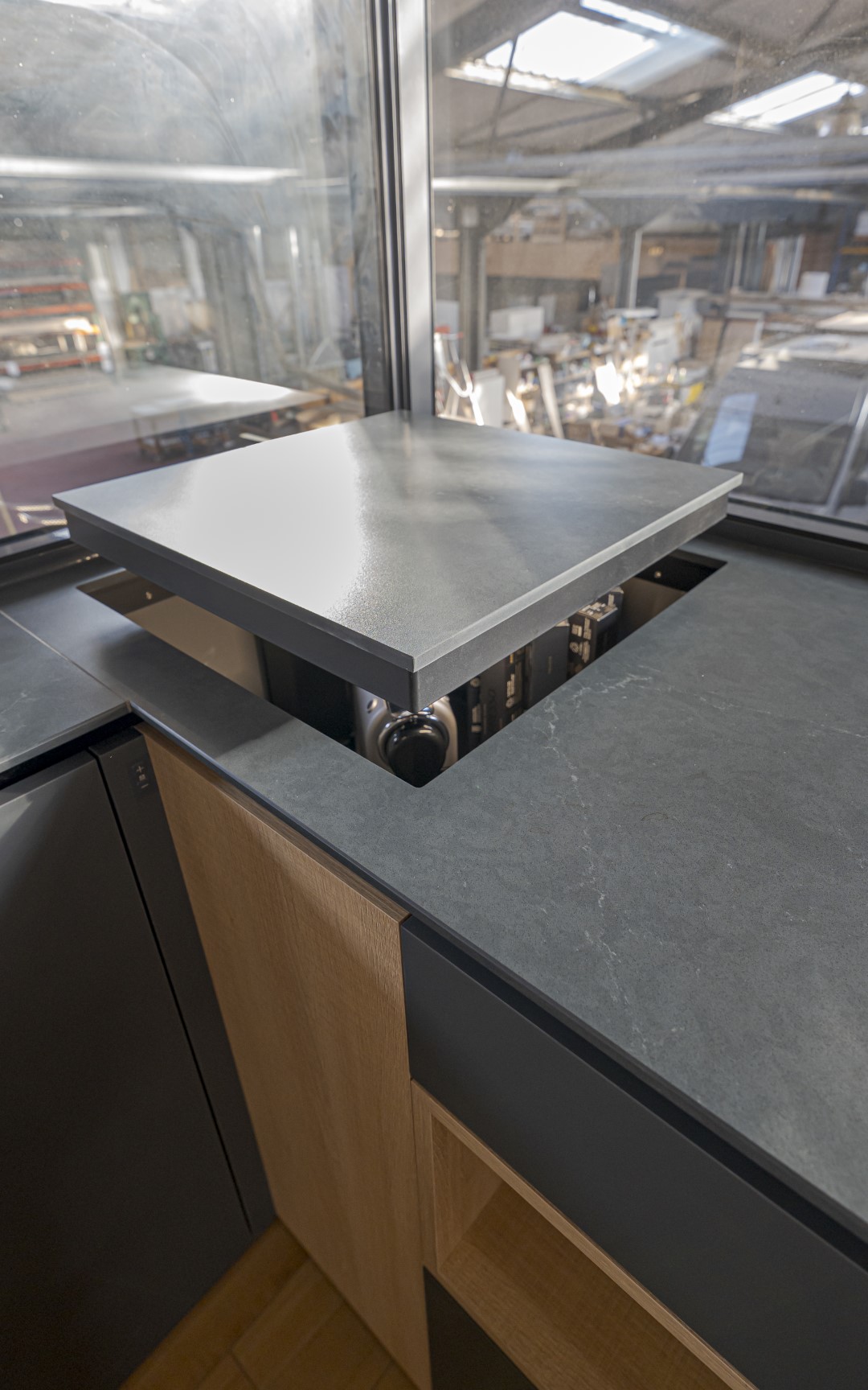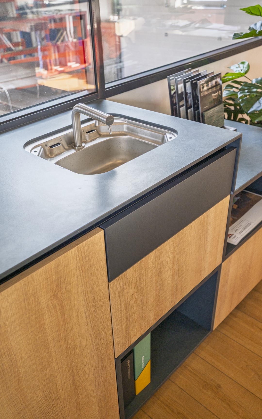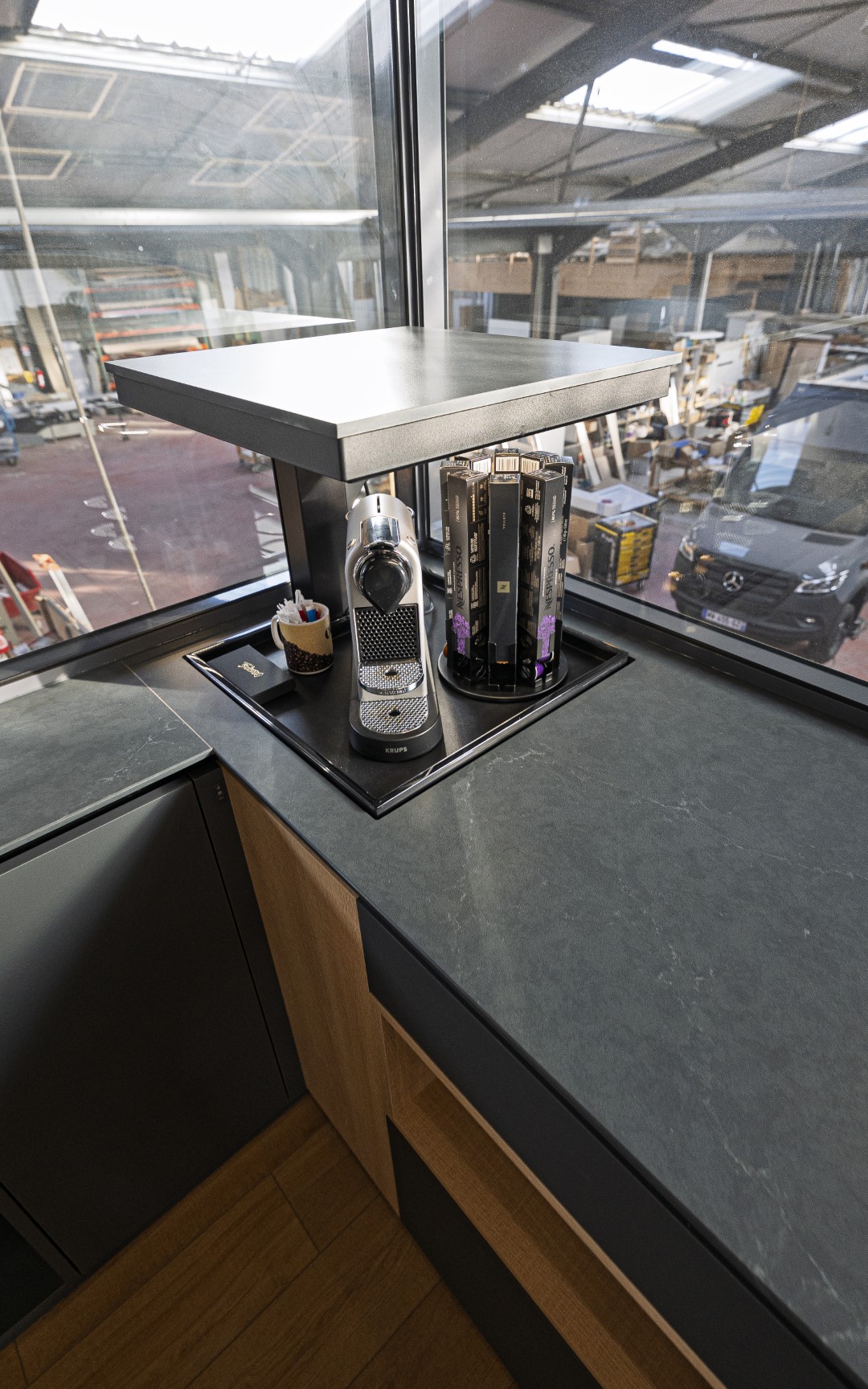 La machine à café intégrée est encastrée dans le meuble, offrant un accès facile et un design soigné. En complément, l’évier intégré permet de nettoyer rapidement tasses et accessoires, garantissant un espace toujours propre et fonctionnel. De plus, les étagères et compartiments de rangement offrent un espace organisé pour les tasses, capsules, et autres accessoires, tout en conservant une apparence épurée et professionnelle.