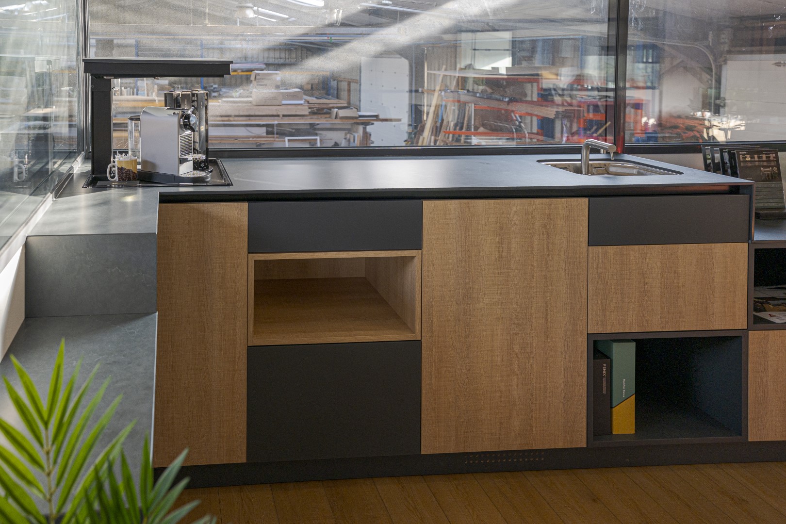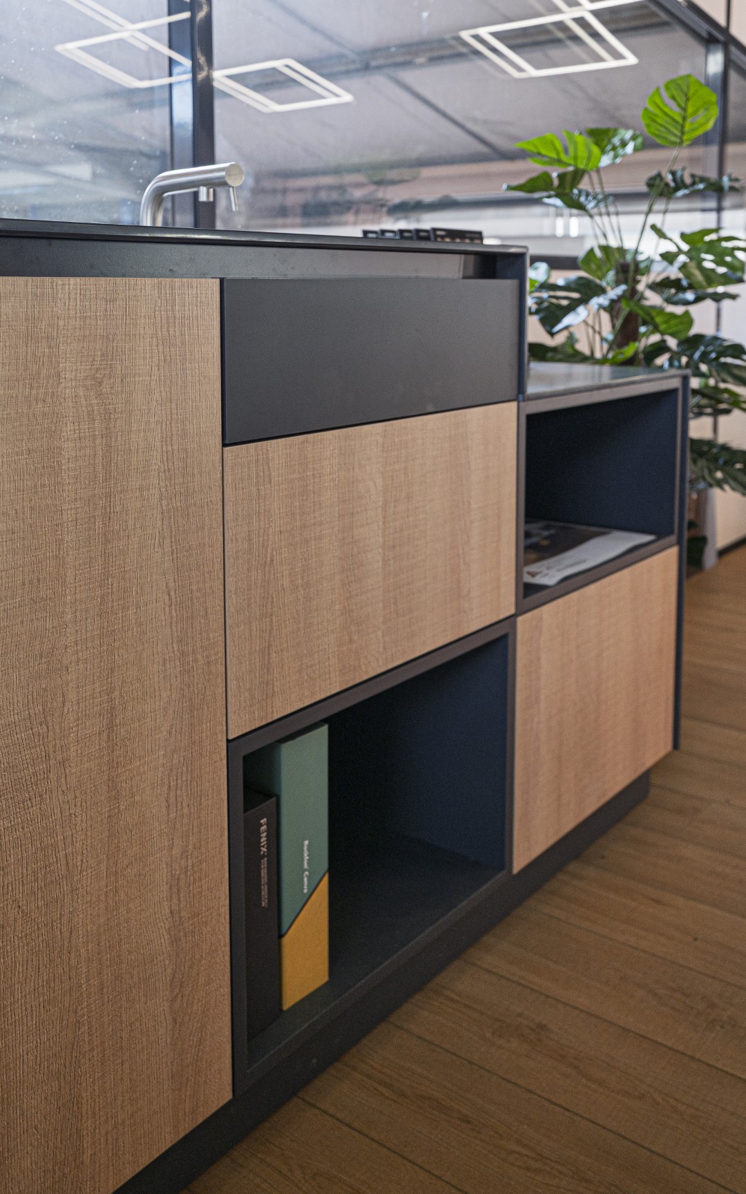 Ce meuble pour salle de pause se distingue par son style contemporain, associant harmonieusement bois clair et panneaux noirs. Les lignes épurées et les formes géométriques apportent une touche d’élégance et de modernité à votre espace.