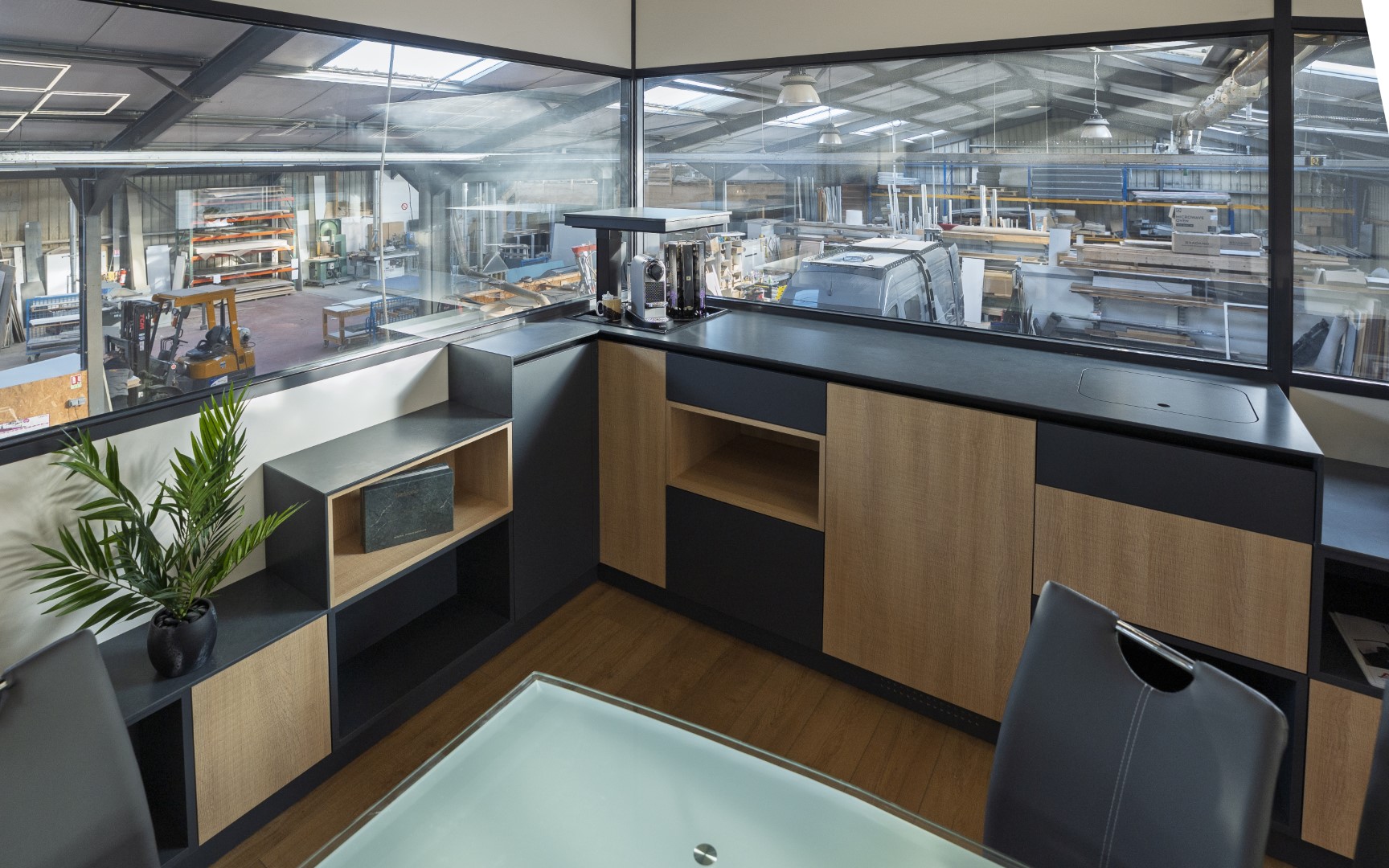 Ce meuble sur mesure pour salle de pause offre plusieurs atouts pour répondre à vos besoins quotidiens.