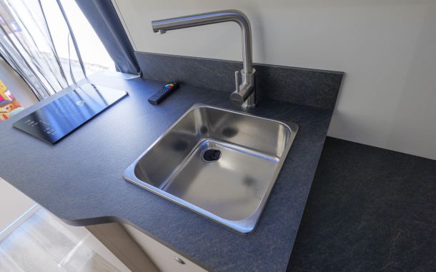 Ce véhicule intègre une cuisine sur mesure équipée d’un évier inox, d’une plaque à induction et de nombreux rangements malins. Le plan de travail en finition sombre contraste élégamment avec les façades mates des meubles. Des LED bleues intégrées viennent souligner les lignes du mobilier pour une touche moderne et lumineuse.